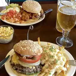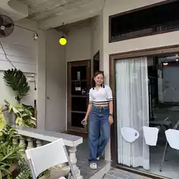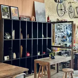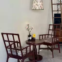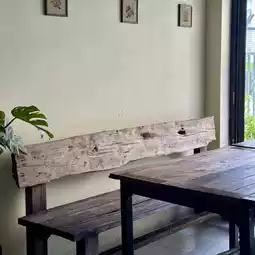 The decor emphasizes wood tones and furniture, with both indoor and outdoor areas perfect for chilling out or working.