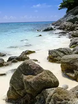 Hin Sai Bay: A snorkeling spot with crystal clear waters revealing the white sandy bottom and schools of clifffish.