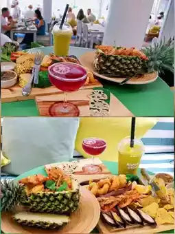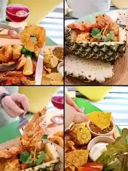 Grilled prawns, Gillette fried squid, grilled salmon, mussels, vegetables and Mexican crisps