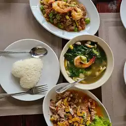 🔆Krua Thammachat Phuket🔆 is a long-standing authentic Phuket local restaurant. The wooden floor is decorated to make you feel like you're dining in a treetop, creating a shady atmosphere. The lush greenery provides a cool, refreshing atmosphere, even during the day.🔆