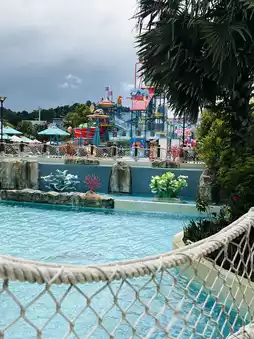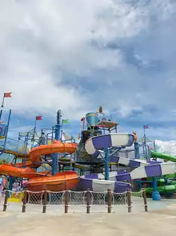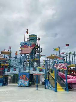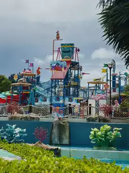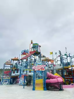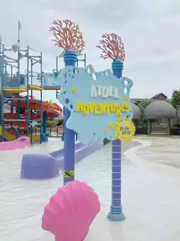 • "Atoll Adventures" is a water play zone designed for families and children, located within the Coral World section of Andamanda. It features a three-story play structure with approximately 8 slides and interactive water toys such as water guns, showers/nozzles, faucets, etc. Additionally, there is a large water bucket (~500 gallons) that pours water at set intervals (approximately every 5 minutes) to enhance the water fun experience.