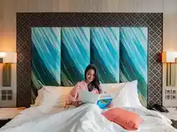 The spacious rooms are beautifully decorated in a modern style, featuring wood tones and sea-blue art on the walls, creating a warm and relaxing atmosphere. Wake up to soft sunlight and mountain views from the windows. The bed is so comfortable you won't want to get up.
