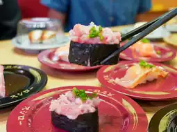 You can pick up your sushi from the conveyor belt or order from a tablet. Your order will be delivered to your table from the upper conveyor belt. When you're done, separate the plates by color. A staff member will count the colors you've eaten.