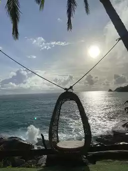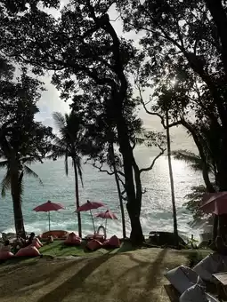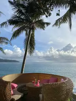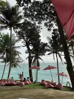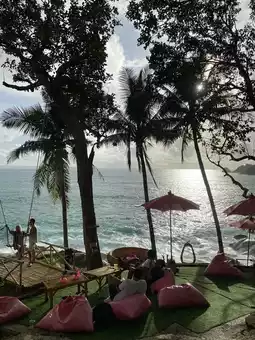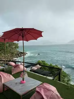 Cafe lovers, don't miss this. When you come to Phuket, you must come to sit at this pink cafe. I was amazed by the view!!! It's so beautiful, so mesmerizing that I want to capture this atmosphere and take it home. The sea is still beautiful even on a cloudy day. The shop is very spacious. Both food and drinks are priced in the hundreds, but the view is worth millions. There are so many photo spots. I really like the picture on the swing. It feels like being at the sea in a foreign country. In the evening, watching the sunset gives a romantic feeling. This is considered one of the cafes in Phuket that you shouldn't miss. #SeasideTravel #PhuketRainySeason #CafeReview #CafeLife #Phuket