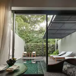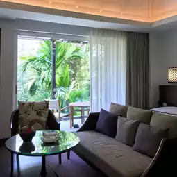 The Beachfront Layan Pool Villa has 2 rooms: a bedroom and a living room, which are not connected. The bedroom has a bed and a dressing area. There will be a bathroom, a spa tub, and a toilet. The equipment is quite complete, such as toothbrush, toothpaste, razor, after sun & lotion, etc. The living room is decorated with trees, giving a shady feeling. The view in front of the room is the swimming pool. You can lie down and enjoy the breeze and listen to the sound of the waves. There are capsule coffee and a coffee machine (I like it very much).