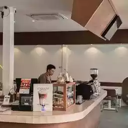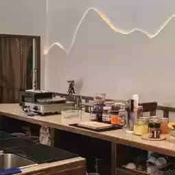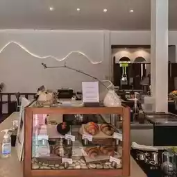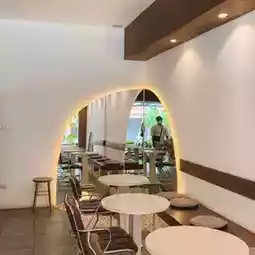 A cafe with a white-brown theme. There is a Japanese rock garden in the middle of the shop with a large mirror. It is a good photo spot. Crepes start at 240.- and come in a very large plate.
