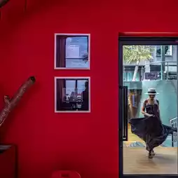 by the bright red film developing room. Inside the shop, there are