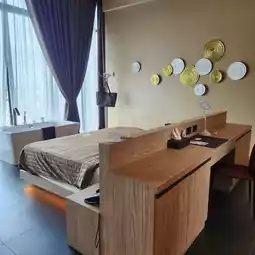 Room condition is quite ok except that the towels and bed linen look tired. Bed is comfy for a good sleep. Bathtub can squeeze in 2 pax in upright sitting position. You can also jump into the pool straight from the room. You get 4 bottles of mineral water everyday which should be sufficient. The bathroom amenities can be replenished everyday.