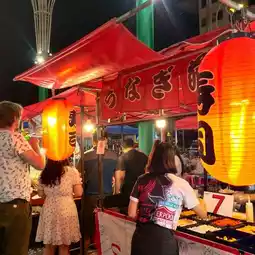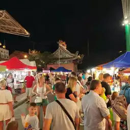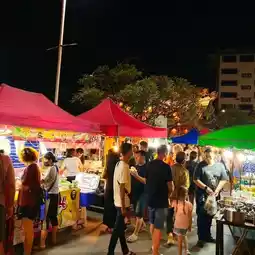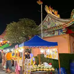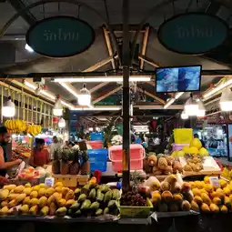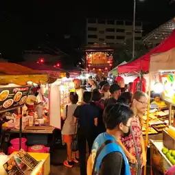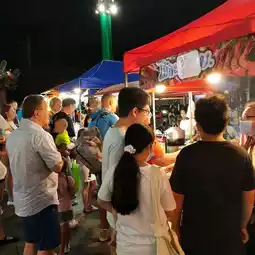 Now, around the market in the evening, there is a night market. There is a lot of food and the price is not expensive. There is Western food, Thai, Japanese, Isaan food, rice with curry, grilled food, fruit juice, desserts. There are so many to choose from.