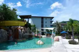 The hotel features two swimming pools, including one for kids, with a water slide and giant squid water sprayer for endless fun. Perfect for family vacations!