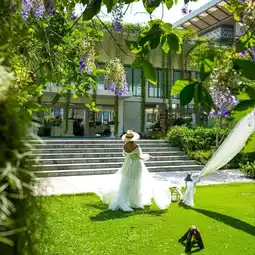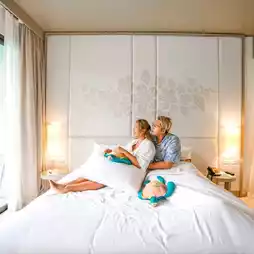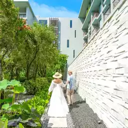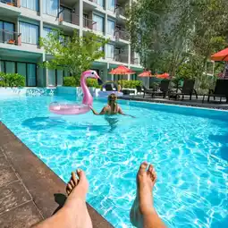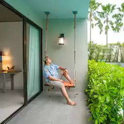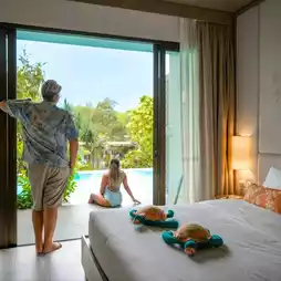 #Drag your boyfriend to sleep in beautiful Phuket and it's close to Nai Yang Beach. It only takes 5 minutes to get there because this is Proud Phuket. The room I stayed in was a Pool Access type. You can walk straight from the balcony to the pool. It's on the 2nd floor and you can see the green view of the accommodation. The room is spacious and has a bathtub that you can open the curtains to see the bed and the pool.