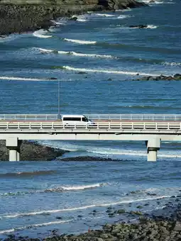 (Pro tip: Wait for a white van to pass by and capture the moment! Lower your camera angle to shoot the splashing waves. The bridge's lines create a striking composition! Use the "Soft Film" filter for a cinematic touch.)