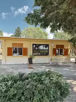 A small house with a yellow wooden door