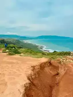 Blue sea, wide sky, red clay cliffs, and wide green grassland! 🥹