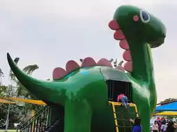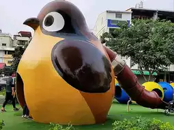 The park features many large animal-shaped play structures, including a two-story dinosaur slide, a giant Shiba Inu slide, an elephant triple-slide, a cat slide, a whale slide, a sparrow pipe slide, a caterpillar tunnel, and mini slides shaped like an octopus and a crocodile. Even toddlers can enjoy the fun here.