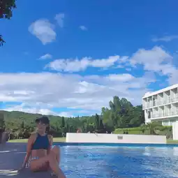 The main building is mainly white, which creates a quiet and peaceful atmosphere with the blue sky, swimming pool and green plants. You may even see wild monkeys on the way to the gym.