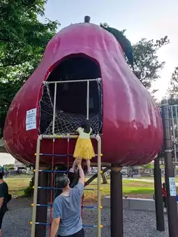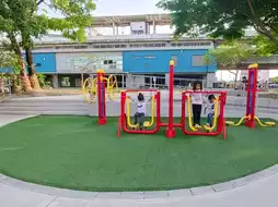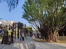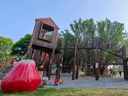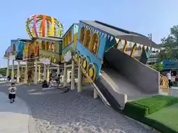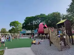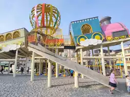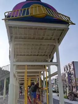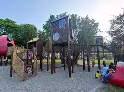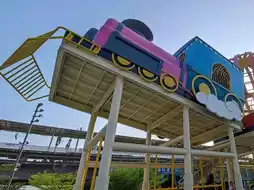 The park's highlight is its colorful, train-like structure that seems to fly, with vibrant tracks winding above the play area, as if carrying children's dreams into the sky. This flying train has become the park's iconic landmark and a must-visit photo spot for parents and kids, both during the day and at night. Surrounding the playground are lush green pathways, seating areas, and shaded facilities, providing a safe and relaxing environment for parents to accompany their children while enjoying the natural surroundings. This place is more than just a playground; it feels like a community-friendly park for families.