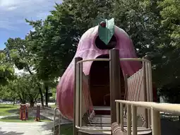 The playground features two major attractions: a sculpted flying train and a wax apple-shaped play area.
