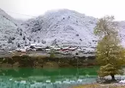 The emerald green of Tianmu Lake is rippled with the red leaves and snow scenes of the high mountains along the coast, as well as the snow-capped mountains, colorful forests and green waves of the ancient Baima people in the Paxijia village. This is the Baima style in early winter.