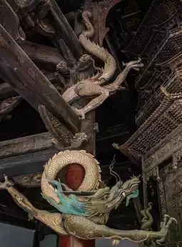 ① The Sutra Relic of the Wheel of Revelation in the center of the Huayan Collection is a pagoda-shaped vessel made of golden nanmu wood. It symbolizes the cause and effect cycle of Buddhism. The upper end is inserted into the hall beam, and the lower end stands on a cast iron anvil in the center of the circular pit. It can still rotate smoothly. Because it is made of nanmu wood, it is anti-corrosive and anti-termite. It is the best preserved and most exquisitely crafted of the few revolving sutras in China. The dragons carved on the pillars on both sides are coiled around the pillars, which is quite shocking.