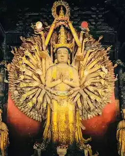 🌟 Thousand-Hand Guanyin Statue: Located in the Hall of Great Compassion, this statue stands approximately 9 meters tall. Its main body is meticulously carved from a single piece of golden nanmu wood, resulting in a lifelike and exquisite portrayal. Each hand is intricately carved with a wide-open eye of wisdom and holds various Buddhist instruments, creating a breathtaking spectacle. 🙏