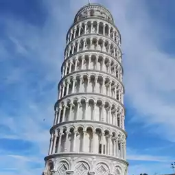 The Leaning Tower of Pisa in Italy is famous for being a large tower that tilts at an angle. Seeing it in person, it truly is leaning! Standing tall and white on a vast green lawn, the Leaning Tower of Pisa is truly impressive.