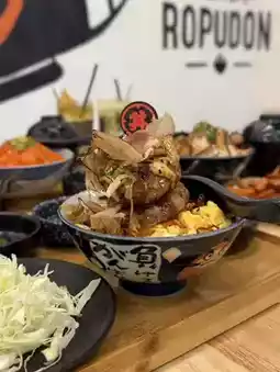 Ropudon’s signature donburi bowls are generously portioned, served with premium Japanese Calrose rice and accompanied by classic side dishes like miso soup, shredded cabbage, potato salad, bean sprouts, and kelp. Some standout donburi options include: