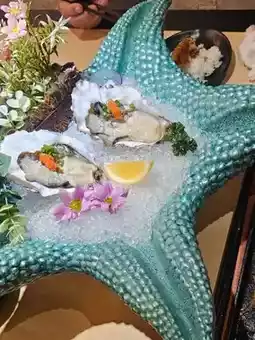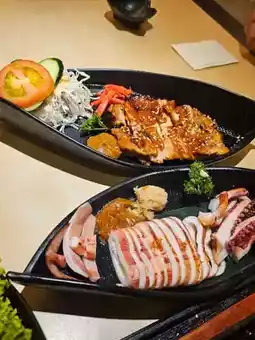 Bday girl request! Had grill sotong, teriyaki chicken, hot plate pork set meal, chicken floss eggplants, mango sushi roll, oysters!, wasabi prawn, 3 more side dish and a jug of fruit juice and beer!