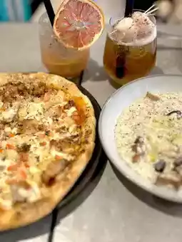 Strongly recommend their pizzas! Ordered chicken pizza, truffle risotto, 4 drinks (chef kiss 👨🍳, drinks just the right amount of sweetness, sourness, bitterness)