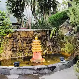 The entire island is a garden of tropical plants, with bright flowers blooming in every corner. Cobblestone paths lead to each serene room, with iron carved lampshades swinging on the branches, adding an antique beauty.