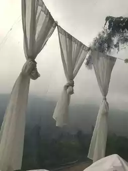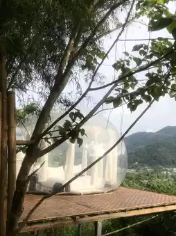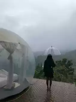 🫧 This is a clear bubble dome-style accommodation with a beautiful view, surrounded by mountains and lush nature. At night, you can enjoy stargazing. The weather is very cool, especially at night and in the morning. (When we visited, it was raining, but the weather was very cold, so we missed the stars and got to see raindrops instead.) Although the accommodation is a clear dome, there are curtains that can be opened and closed for privacy. The bathroom is outside, an open-air room on the upper floor. There's a water heater.