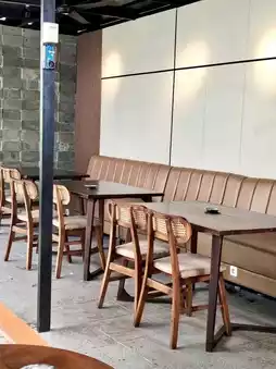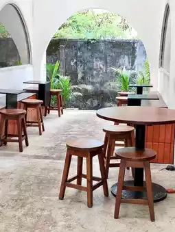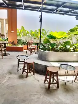 The structure is painted a clean, bright white, offering a crisp contrast to the warm, earthy tones of the burnt orange or terracotta columns and low planters. These planters, filled with white stones and vibrant green foliage like broad-leafed plants and smaller groundcovers, bring life and a refreshing feel right up to the seating area. The seating itself, visible further down the path, consists of simple wooden tables and chairs, suggesting a casual and relaxed spot for patrons.