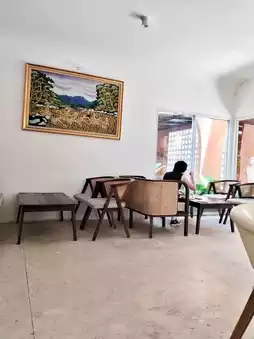 Floor-to-ceiling glass windows and doors run the length of the building, maximizing natural light and offering views into the interior, where a few silhouetted figures can be seen. This transparency enhances the connection between the inside and the exterior patio. The outdoor area to the left features a concrete path bordered by a well-maintained lawn and a couple of young, potted tropical palm trees, emphasizing the sunny, open-air setting. The use of natural materials, warm colors, and abundant greenery gives the entire space a serene, comfortable, and distinctly contemporary tropical vibe, perfect for unwinding or productive work.