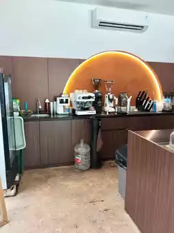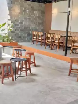 Beyond this area, the space opens up into a more defined seating zone with built-in low, terracotta-colored benches and small tables, perfect for groups. The ground here features a mix of gravel and manicured greenery, including small, decorative trees and a raised, circular garden bed.