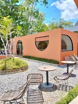 The bright sunlight indicates a midday or early afternoon setting, casting strong shadows and highlighting the rich texture of the walls and the glossy appearance of the leaves. In the background, there are hints of a larger, darker-colored structure, possibly the main building of the establishment, and a concrete-and-steel building beyond that, suggesting this stylish oasis is situated within a more urban or developing area. The overall impression is one of a serene, contemporary retreat—a perfect spot for a casual coffee, conversation, or simply enjoying the pleasant weather. It is a thoughtfully designed space meant to be a comfortable, visual escape from the typical city environment.