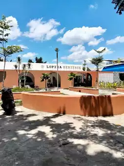 The environment suggests a cafe, restaurant, or a retail/lifestyle space designed to be a gathering spot. Scattered around the scene are young trees, some with slender trunks and minimal foliage, and others with more substantial canopies providing patches of shade. The mature, dark green leaves of a tree on the right side of the frame cast large, intricate shadows onto the ground, offering relief from the midday sun. In the immediate foreground, a couple of motorcycles are parked, suggesting that this is a popular, accessible spot. In the background, a large, blue industrial-looking building is visible on the far right, which is somewhat incongruous with the boutique-like heritage theme, but it highlights the location's setting, likely in an urban or suburban area where modern and commercial zones meet. Overall, the picture conveys a sense of leisure, warmth, and modern design under a brilliant blue sky dotted with scattered white clouds.