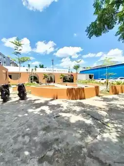 The central focus is the low-slung, white building with the name displayed prominently. Its architecture appears contemporary, featuring clean lines and possibly a minimalist aesthetic, punctuated by curved openings or alcoves. In front of the building is a large, semicircular planter or seating area made of an earthy, terracotta or reddish-brown colored material. This color palette—the warm brown tones contrasted with the crisp white structure and the vivid blue sky—gives the area a bright, almost Mediterranean or tropical feel. The use of curved forms in both the building's facade and the foreground structure softens the look and encourages a relaxed atmosphere. The contrast between the paved, sun-drenched concrete ground and the warm-toned architectural features is stark, creating interesting shadows that hint at the time of day.