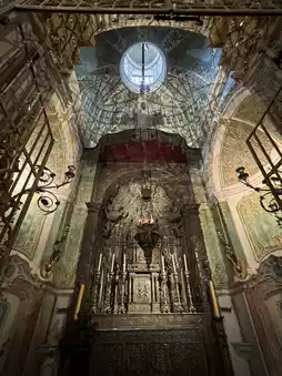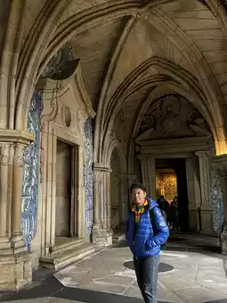 Notably, the cloister (monastic garden) adjacent to the cathedral is lined with traditional Portuguese azulejos (blue tiles) that vividly depict scenes from the Bible.