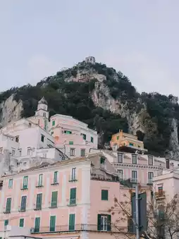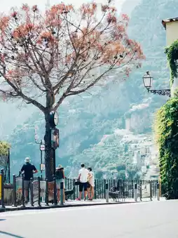 Looking down at the coastline of Positano, white parasols and red buildings shimmer brilliantly under the Mediterranean sun.