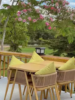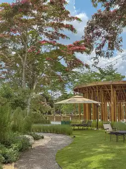 Surrounded by nature, you'll find views of trees, mountains, and a colorful flower garden. The cafe is decorated with woven bamboo structures.