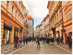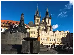 Historical buildings stand around the square, and in the center is a monument to the religious reformer Jan Hus.