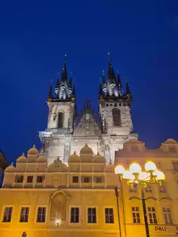 During the day, it's filled with lively laughter and people, while at night, the Church of Our Lady before Týn is illuminated, transforming into a fairytale-like scene. The silent spires, peering upward, add depth to the Prague night. 🌌⛪💫