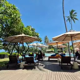 Located on the banks of the Pak Nam Pranburi River, near the popular check-in spot, Tal Sam Ton, this five-star hotel boasts a spacious setting. Perhaps the most striking feature is the hotel's large, long, saltwater swimming pool, offering stunning sea views. There are separate children's and adult pools. For the Deluxe Pool Villa, guests will have their own private pool and a full range of amenities, including a minibar, complimentary tea, coffee, and drinking water. The spacious, comfortable six-foot bed is incredibly comfortable. The bathroom has separate dry and wet areas, with a door leading to an outdoor walkway. The hotel's Afternoon Tea Set is delicious, freshly made, and offers generous portions at an affordable price. The open-air restaurant offers a relaxing atmosphere with a cool breeze and stunning sea views. The staff are excellent, friendly, and extremely attentive. The room rate is a few hundred baht, but you get a private pool villa with breakfast for two. If you're visiting Pak Nam Pran, I highly recommend staying here. It's truly amazing!