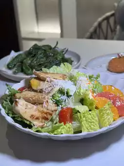 A refreshing creation, the slow-cooked chicken breast is tender and served with salad vegetables, small tomatoes, oranges and grapefruit, plus shredded cheese