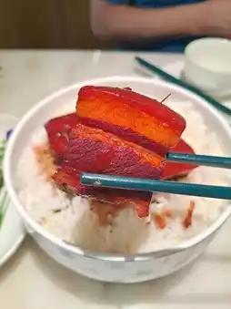 Four thick pieces of Dongpo pork are laid over rice. The meat is fragrant and tender, melts in your mouth, and the sauce is well braised, rich but not greasy, perfect with rice.