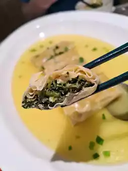 The bean curd skin wraps mustard greens and minced meat filling, served on a golden broth, with an elegant appearance and a fresh, savory taste.