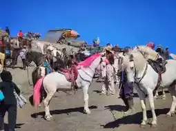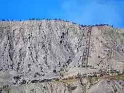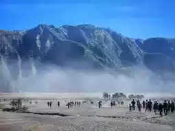 When I went to see Bromo from the viewpoint, it was not as amazing as I thought. Maybe because I had seen the mountains in Nepal. But when I actually arrived at Bromo, it gave me a different feeling. It felt like I was not on earth and these people were queuing up to get on a ship. It was a very strange view, but cool. Looking back is cool too.