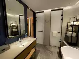 I was also upgraded to a mountain view room this time, respect to Marriott, which might be one of the reasons I keep choosing them, haha. Additionally, this must be the newest hotel under Marriott I have stayed in, as it opened in 2023. Previous reviews have mentioned that Marriott's software services are top-notch, but most of their hotels tend to be somewhat old. So, encountering such a new hotel is a small but sure delight on a business trip. Since it's a new hotel, the interior decoration is very minimalist and business-like, yet sophisticated. Especially the choice of tile colors in the bathroom, which are elegant and retro.