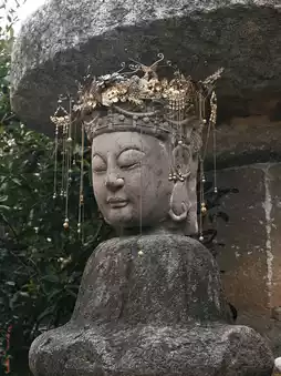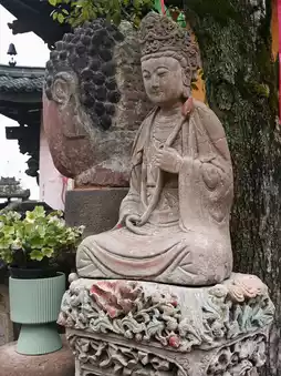 The temple has adopted more than 10 cats and dogs. On the wall, it says, "You can take pictures of the Buddha statues. Feel free to take pictures."