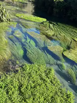 📸 Use a wide-angle lens to capture the stream with floating aquatic plants and stunning blue-green gradients